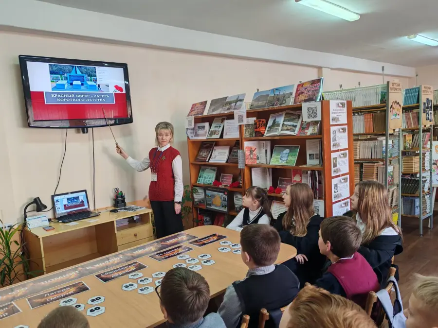 Вместе с библиотекарем пятиклассники почтили минутой молчания всех безвинно убитых детей, послушали стихотворение Леонида Рубинштейна, посвящённое мемориалу «Красный Берег».
