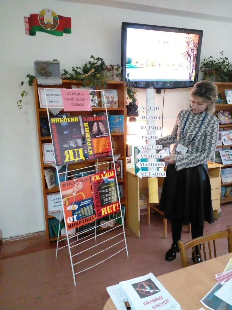 Заведующий школьной библиотекой Е.В. Скорина обсудила с ребятами наиболее распространённые причины курения, привела факты о вреде курения, акцентировала внимание на серии тематических плакатов «Профилактика курения», а также зачитала притчу о табаке.