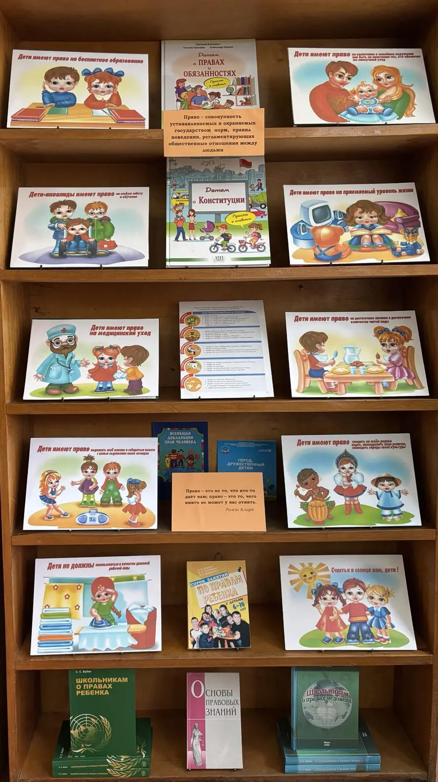 На выставке представлена Конвенция о правах ребёнка, а также книги «Детям о правах и обязанностях», «Детям о Конституции», «Школьникам о правах ребёнка» и «Школьникам о правах человека». В данных изданиях доступным языком рассказывается, что такое право и обязанности человека, какие права и обязанности есть у современных детей. Какие права и обязанности изложены в главном документе страны – Конституции Республики Беларусь. Читателей ждёт экскурс в историю прав и обязанностей ребёнка с древних времён и до наших дней.