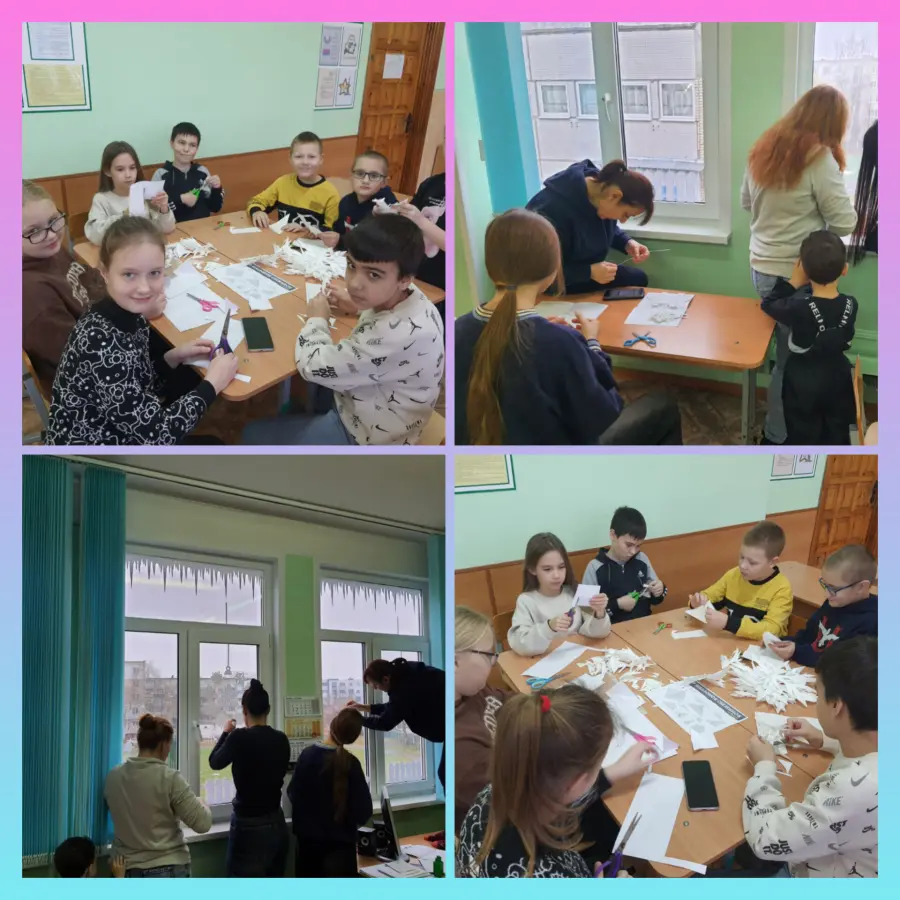Учащиеся 4 и 5 классов вместе с родителями приняли участие в замечательной акции "Украсим кабинет вместе". Дружно вырезая ажурные вытынанки, ребята и их родители украсили окна кабинетов, создав праздничную атмосферу.