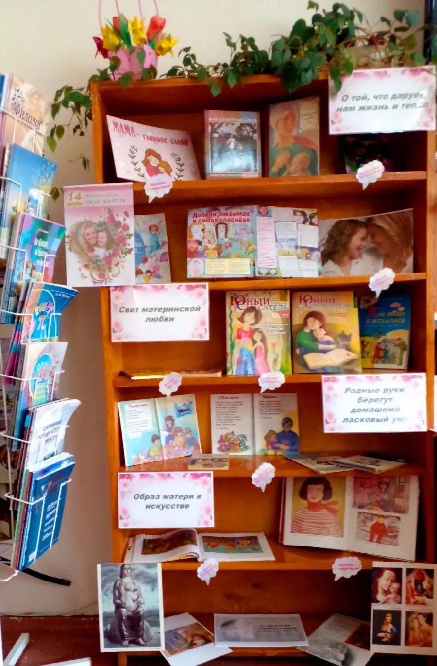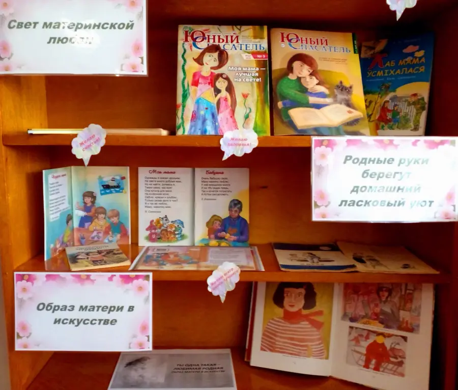 С 10 октября в школьной библиотеке начала работу книжно-иллюстративная выставка, посвящённая хранительнице семейного очага – маме. Экспозиция «Тепло родного очага» включает 4 раздела: «О той, что дарует нам жизнь и тепло», «Свет материнской любви», «Родные руки берегут домашний ласковый уют» и «Образ матери в искусстве». На выставке размещены подборки сценариев, стихотворений, высказывания известных людей о женщине-матери, а также репродукции картин известных художников и детские рисунки. Материалы, представленные на книжно-иллюстративной выставке, помогут поздравить наших любимых мам с праздником – Днём матери.