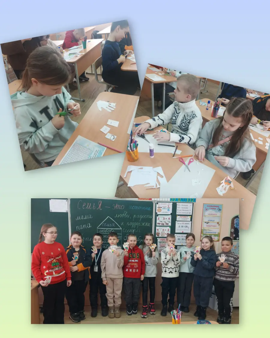 24 января в рамках шестого школьного дня для учащихся 3 и 4 классов прошел творческий мастер-класс под названием "Как я вижу свою семью?". Ребята с увлечением вырезали из бумаги ладошки, где каждый пальчик символизировал одного из членов семьи. Это помогло им наглядно представить, насколько важна каждая часть единого целого – их дружной семьи.